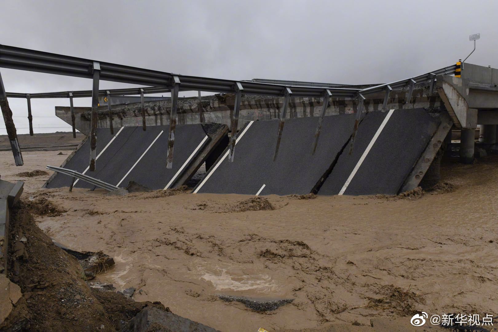 About 10 km away from the Mogao Grottoes, the section where the road meets a bridge was damaged by floods.