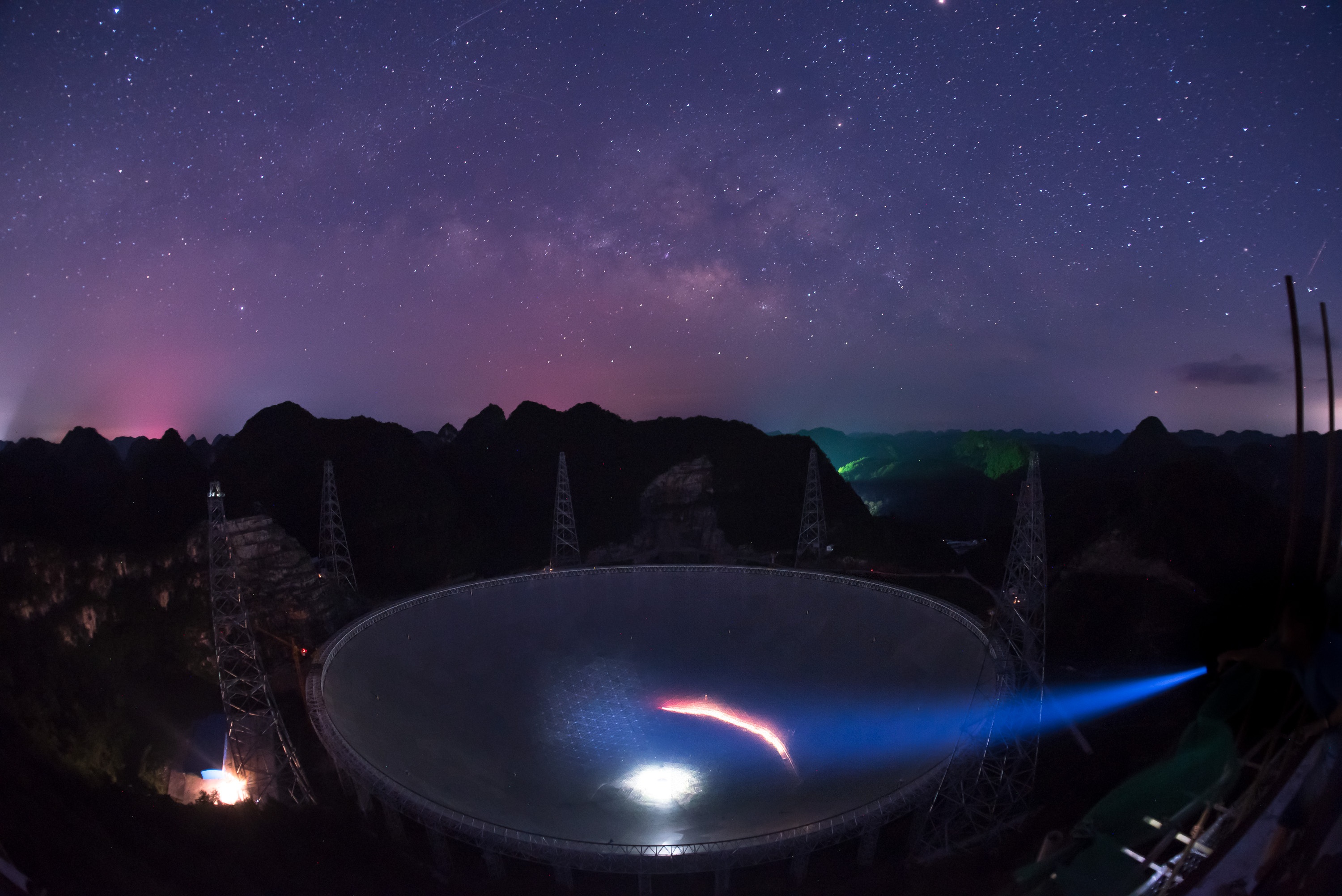 Photo taken on June 27, 2016 shows FAST under the stars. (Xinhua/Liu Xu)