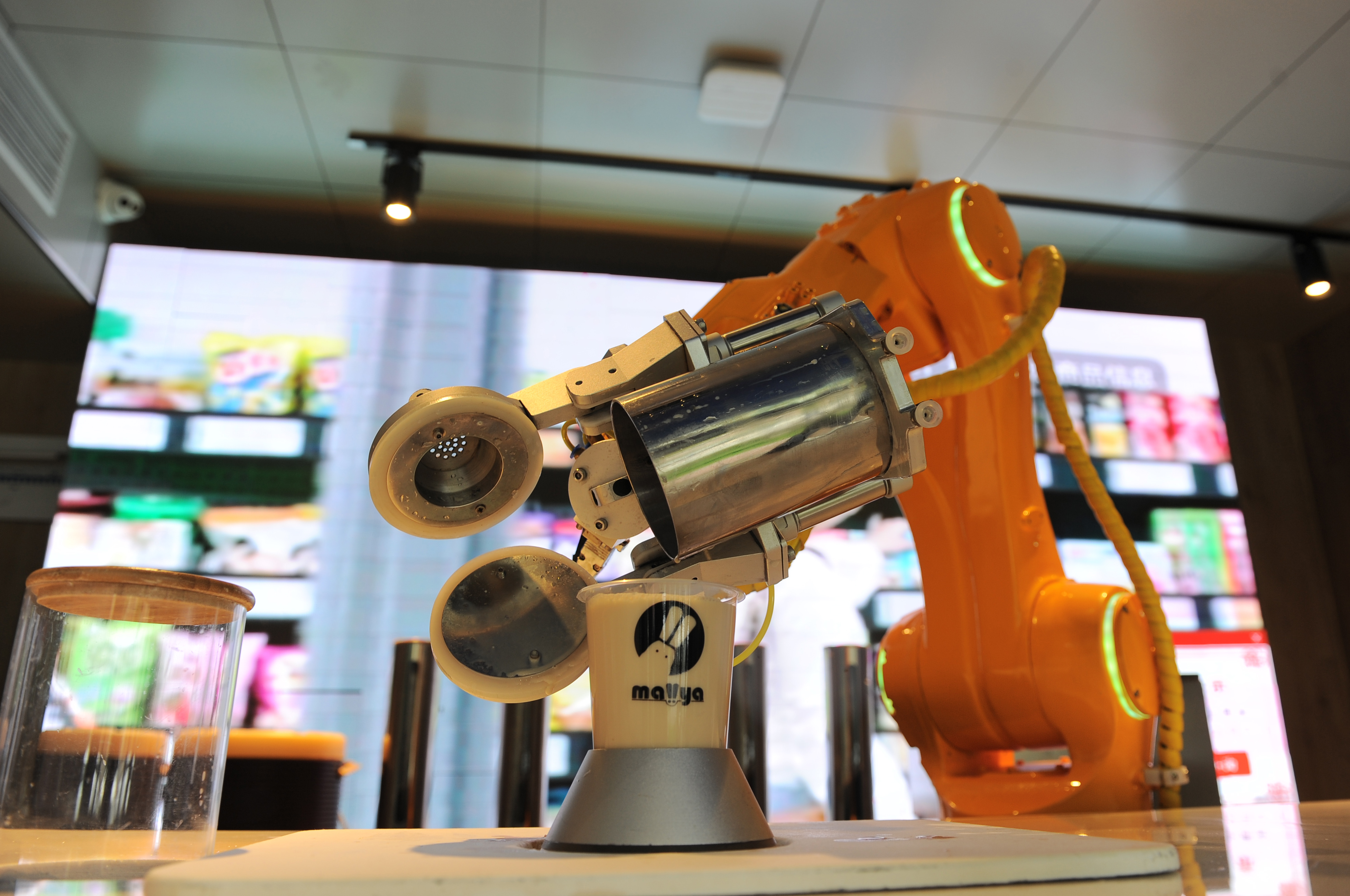 A robot is seen making a drink at Changyang Campus in Yangpu district, east China's Shanghai, June 21, 2019. In recent years, Yangpu District has vigorously developed Artificial Intelligence (AI) industry in the process of industrial transformation, making efforts to establish several innovation zones focusing on AI such as Changyang Campus. (Xinhua/Ren Pengfei)