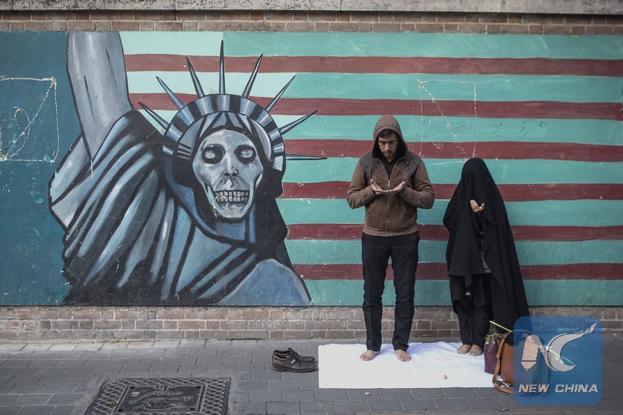 A couple pray after a rally marking the 39th anniversary of the seizure of the United States Embassy outside the former U.S. Embassy in Tehran, capital of Iran, on Nov. 4, 2018. (Xinhua/Ahmad Halabisaz)