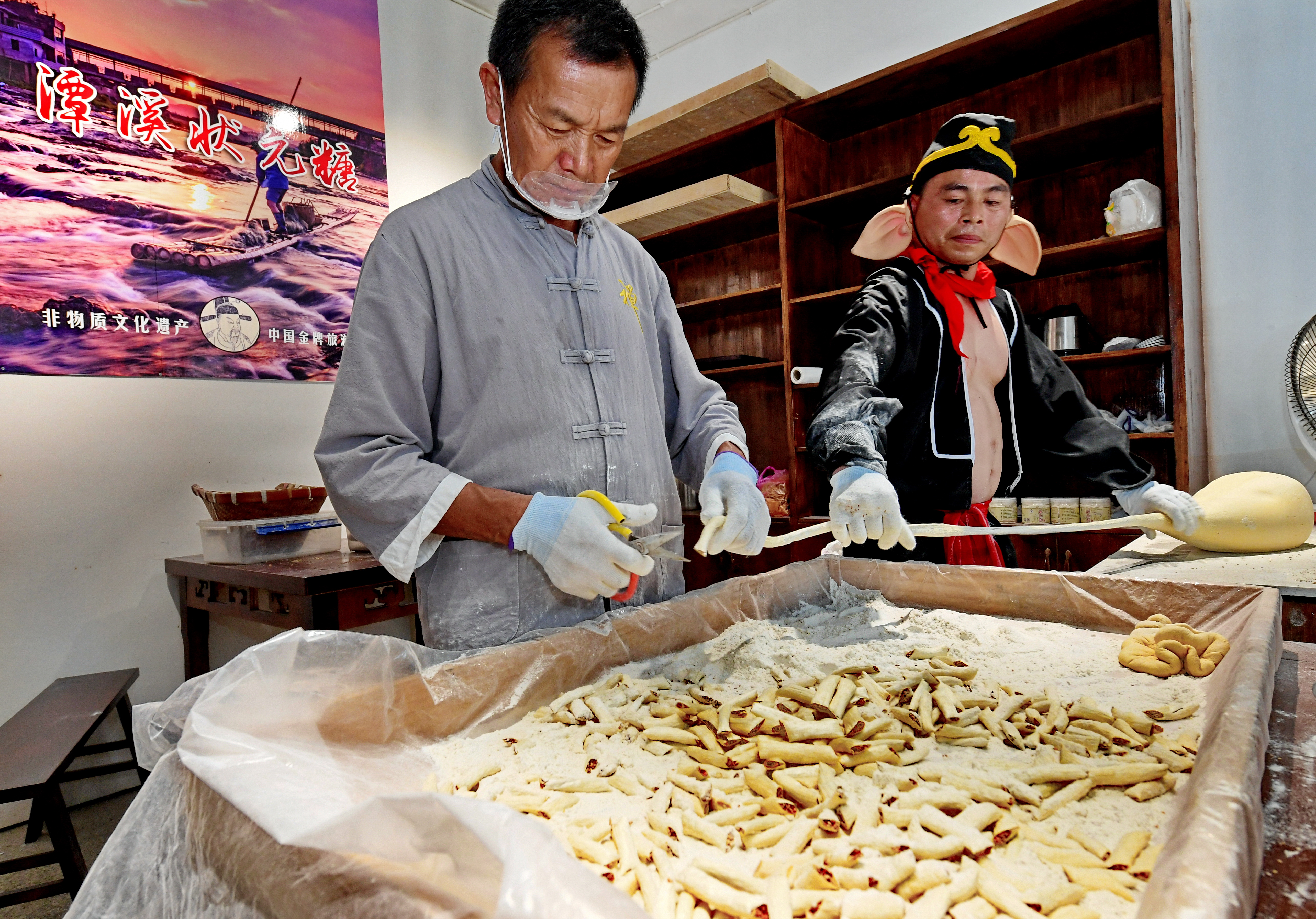 Staff members make the candy at the Jiangxi style snack street in Shuinan Village, Anyi County, east China's Jiangxi Province, Aug. 8, 2019.(Xinhua/Zhang Guojun)