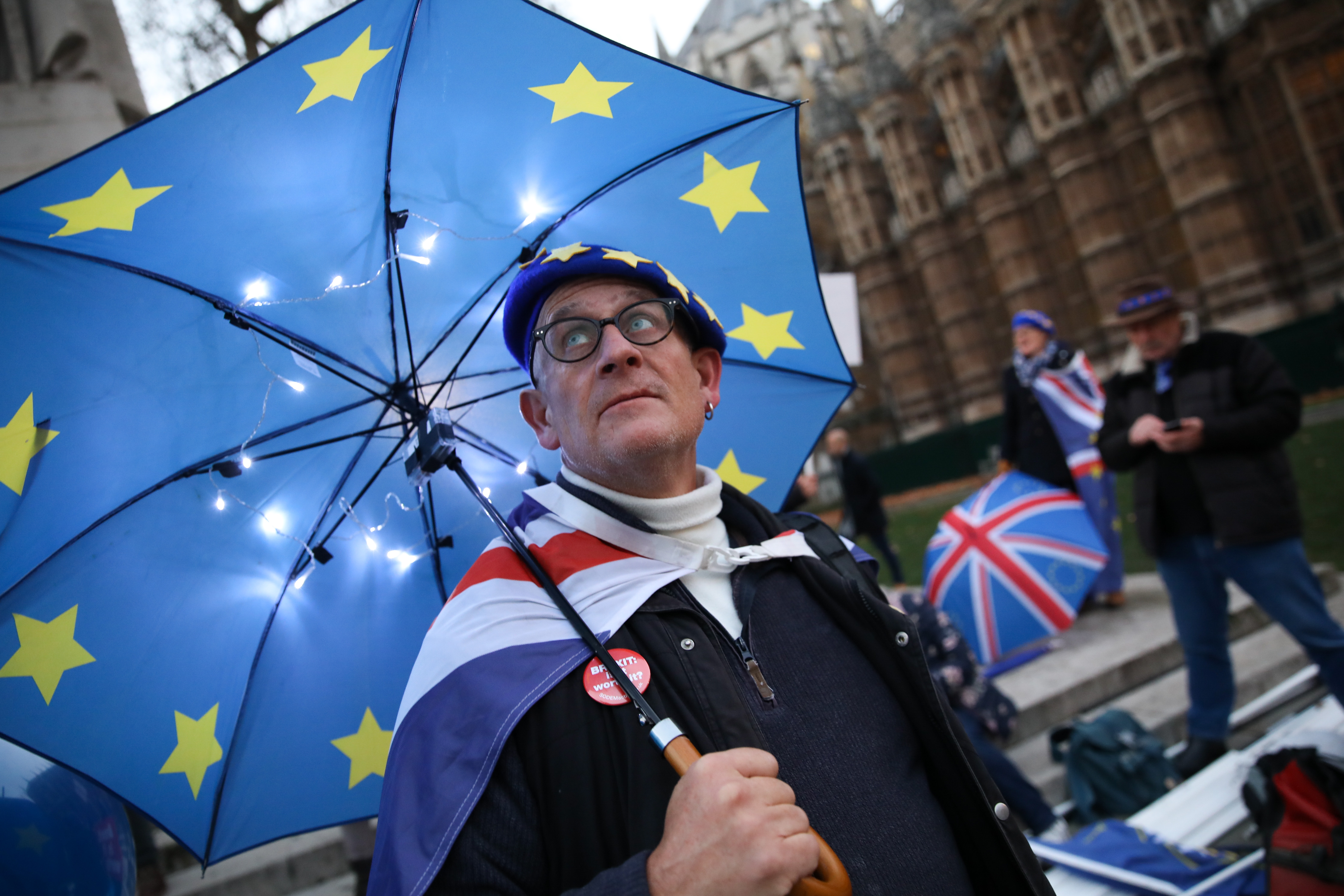 A protester demonstrates outside the Houses of Parliament in London, Britain, on Dec. 10, 2018. (Xinhua/Joe Newman)
