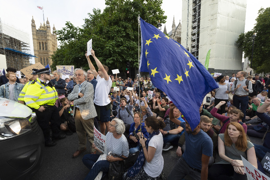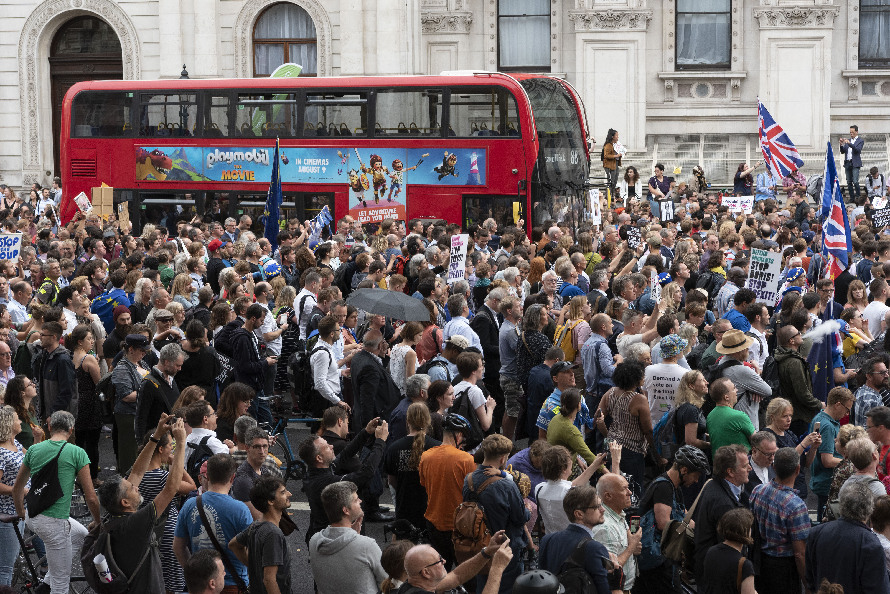 Protesters take part in a demonstration outside the Houses of Parliament in London, Britain, on Aug. 28, 2019.(Photo by Ray Tang/Xinhua)