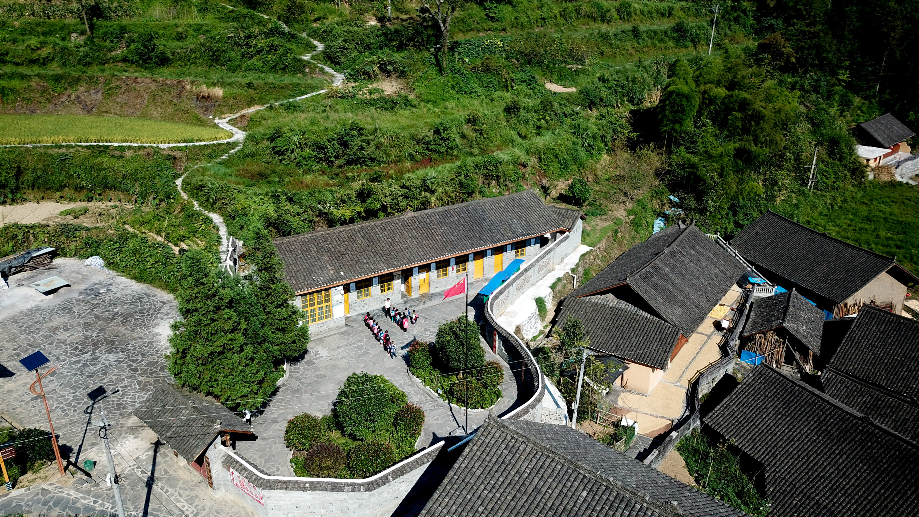 Aerial photo shows the Shibadong Primary School in Shuanglong Town of Xiangxi Tujia and Miao Autonomous Prefecture, central China's Hunan Province, Sept. 4, 2019. (Xinhua/Chen Zeguo)
