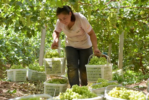 A farmer harvests grapes in Shakan Village, Turpan City of northwest China's Xinjiang Uygur Autonomous Region, July 1, 2019. (Xinhua/Ding Lei)