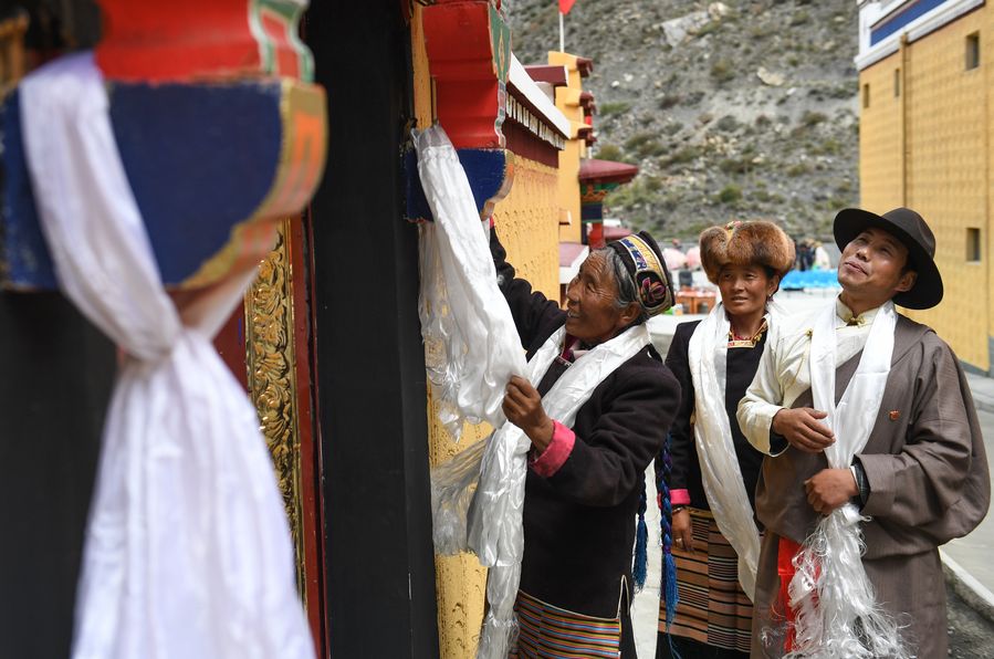 Villager Dainzin Quzhen (front) holds a traditional rite in front of her new house in Lhozhag Town of Lhozhag County, Shannan City, Sept. 21, 2019. (Xinhua/Jigme Dorje)