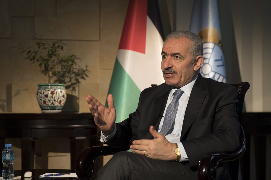 Palestinian Prime Minister Mohammad Ishtaye speaks in an exclusive interview with Xinhua in the West Bank city of Ramallah, Sept. 18, 2019. (Xinhua/Guo Yu)