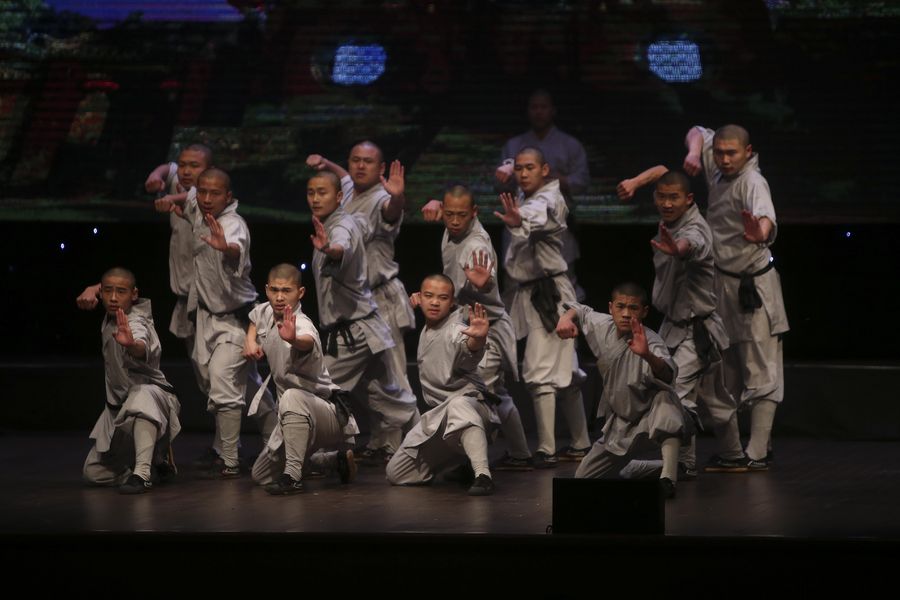 Monks from China's Shaolin Temple perform Kungfu on the occasion of celebrating Chinese New Year with Palestinians in West Bank city of Ramallah, on Jan. 22, 2017. (Xinhua/Fadi Arouri)