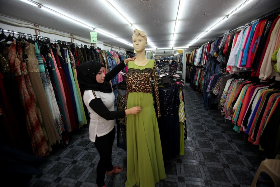 A Palestinian vendor displays Chinese dress at her store, in the West Bank city of Nablus, on Sept. 12, 2015. (Xinhua/Nidal Eshtayeh)