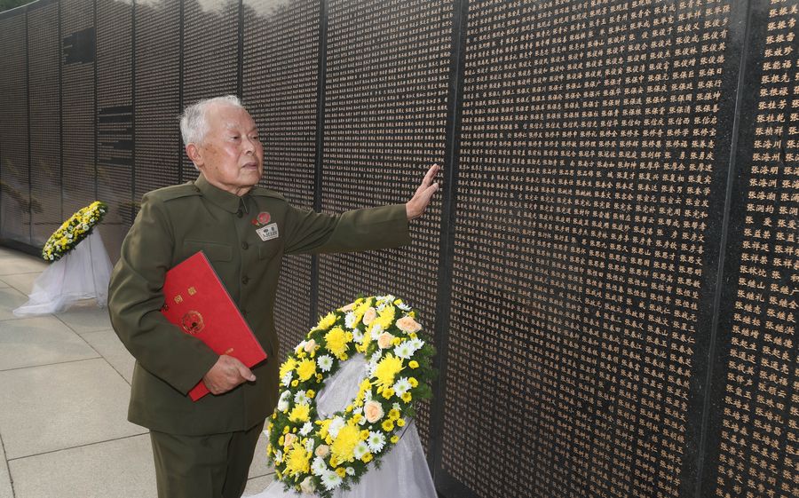 Chen Hushan searches for the name of his brother Chen Zengji on a martyr wall at the cemetery of Korean War martyrs in Shenyang, capital of northeast China's Liaoning Province, Sept. 29, 2019. (Xinhua/Yang Qing)