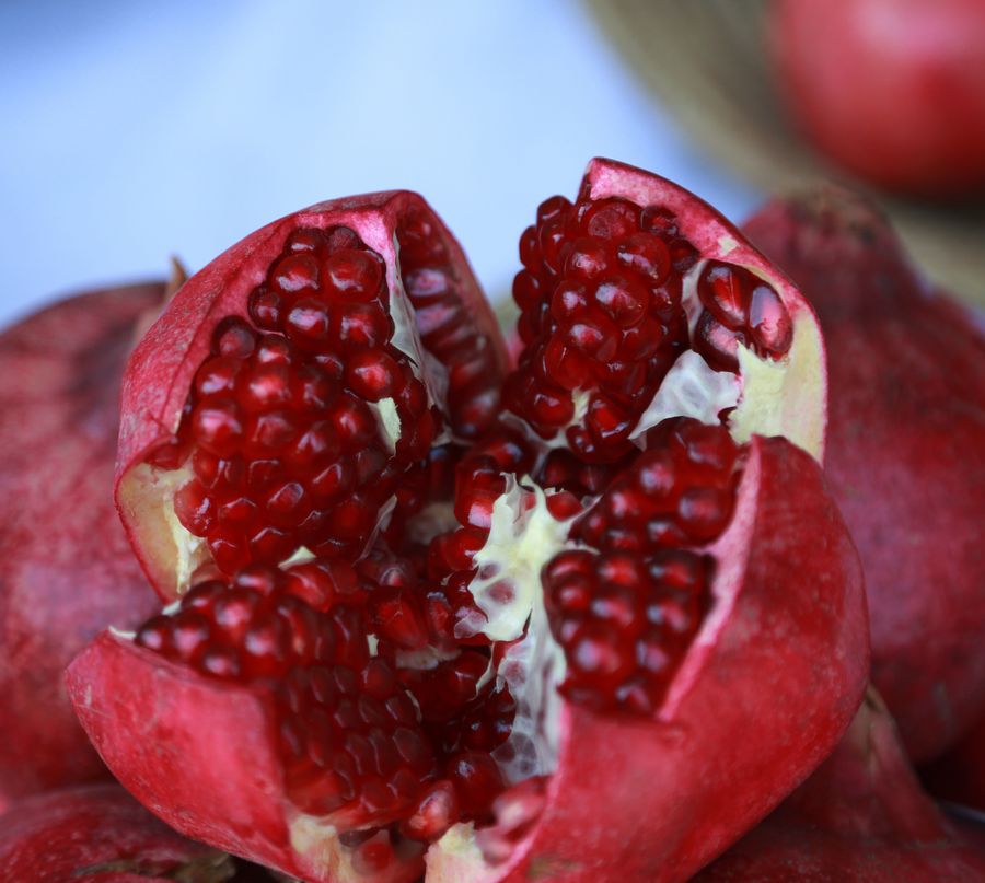 A fresh pomegranate is seen at the Agricultural Fair in Kabul, capital of Afghanistan, Oct. 16, 2019. (Xinhua/Rahmatullah Alizadah)■