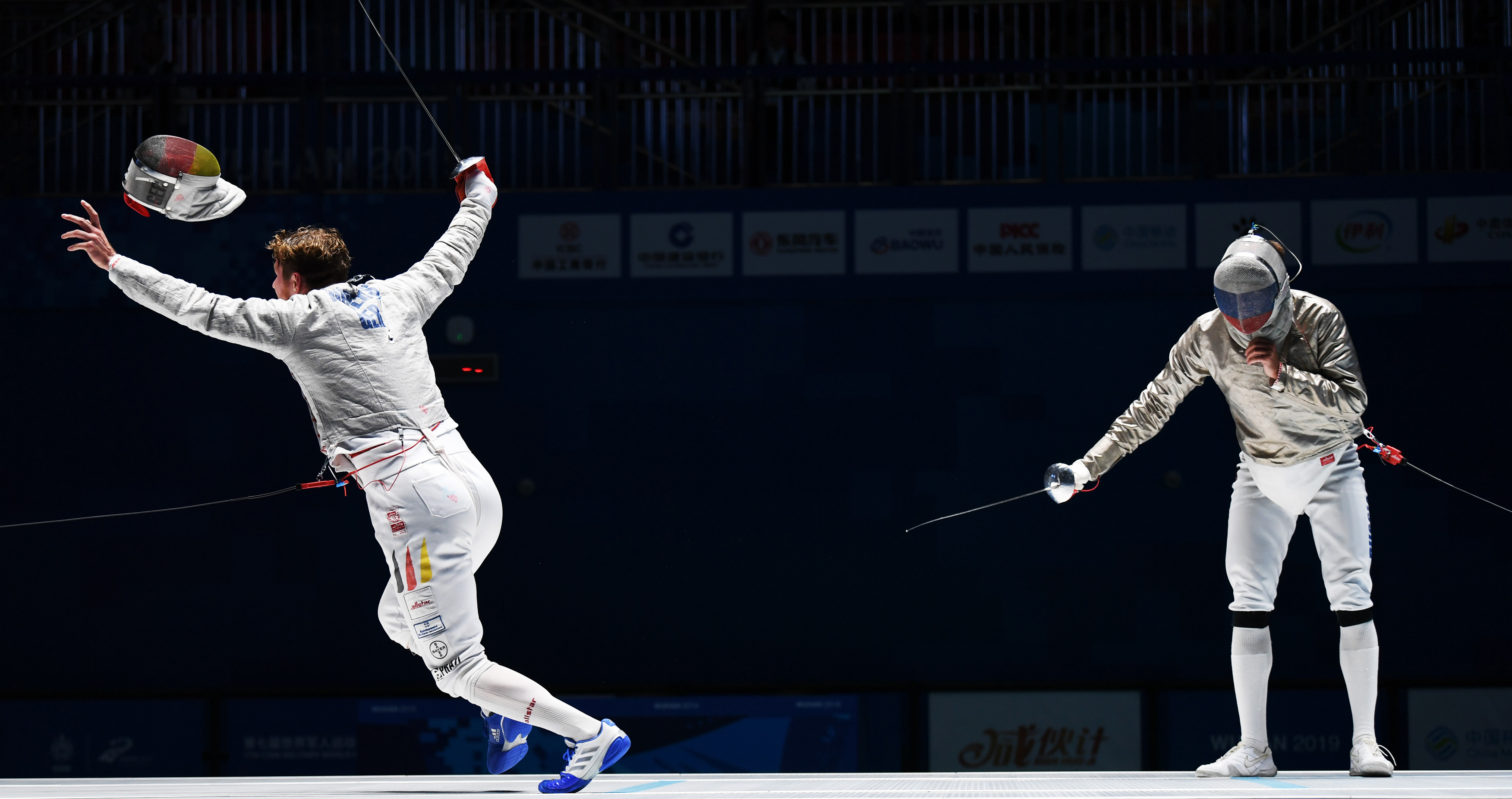 Richard Huebers (L) of Germany celebrates after winning the men's individual sabre gold medal bout of fencing at the 7th CISM Military World Games in Wuhan, capital of central China's Hubei Province, Oct. 21, 2019. (Xinhua/Wang Jianwei)