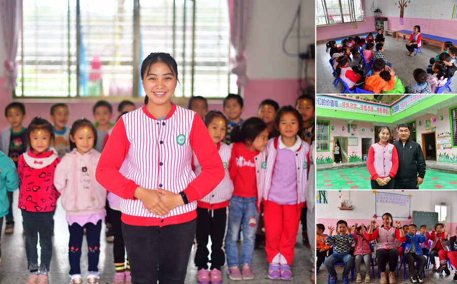 Combo photo shows 21-year-old kindergarten teacher Yang Meiliu posing for a picture (main image in the layout); and Yang's work and life (smaller images in the right-side column), in Banlan Township, Rong'an County, south China's Guangxi Zhuang Autonomous Region, Oct. 23, 2019. Yang's boyfriend, Yang Zhixian, has been working in Banlan Township for seven years. She joined him to work as a kindergarten teacher after graduation from college this year. (Xinhua/Huang Xiaobang)■