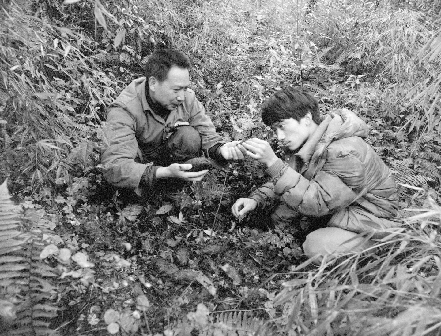 Photo taken in 1983 shows Hu Jinchu (L) studies pandas' waste in the wild. (Xinhua/Jin Xuqi)