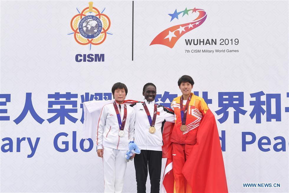Gold medalist Eunice Chumba (C) of Bahrain, silver medalist Pak Il Sim (L) of the Democratic People's Republic of Korea (DPRK) and bronze medalist Li Dan of China attend the awarding ceremony of the women's marathon individual of track and field at the 7th CISM Military World Games in Wuhan, capital of central China's Hubei Province, Oct. 27, 2019. (Xinhua/Hu Huhu)