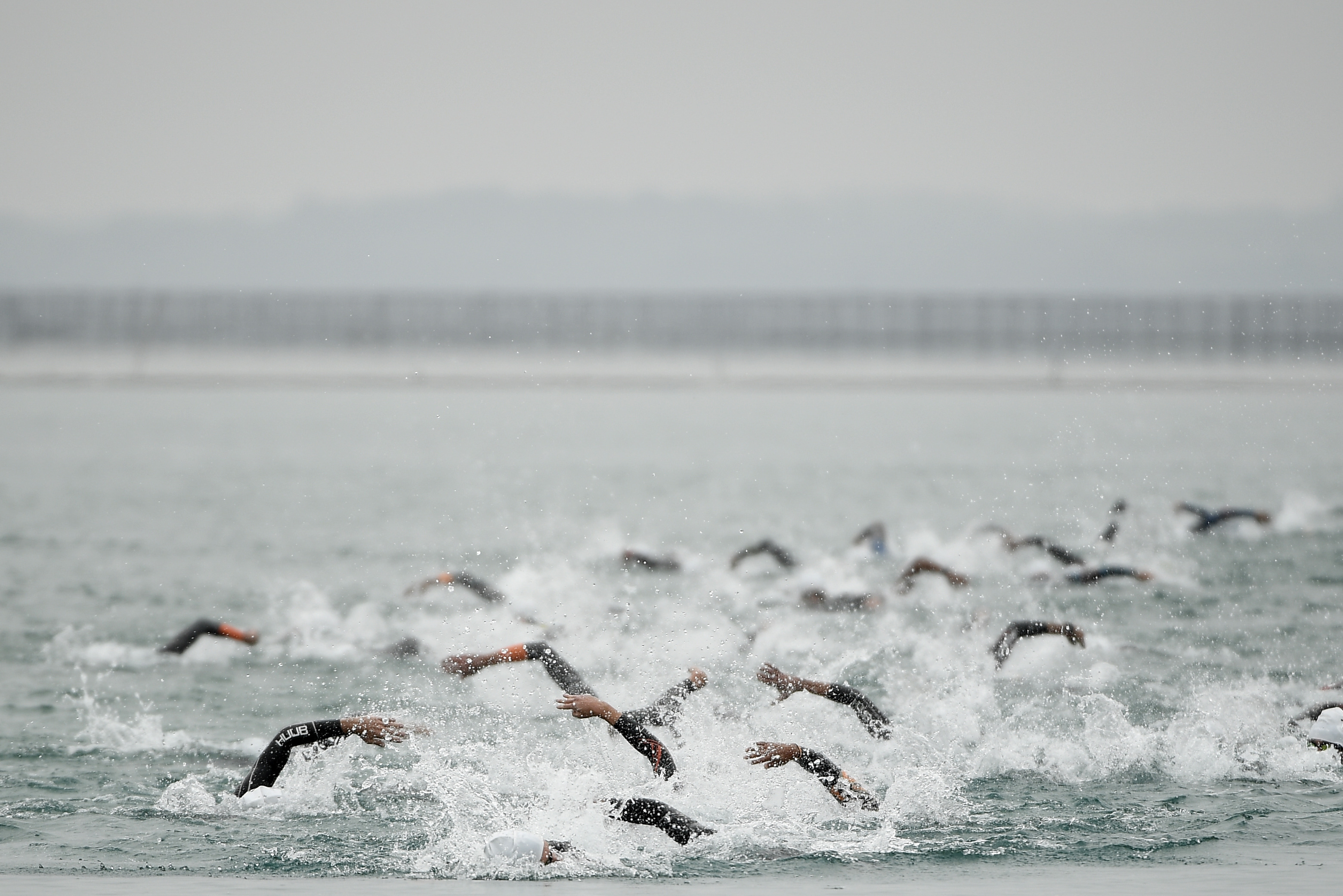 Athletes compete during the swimming of triathlon at the 7th CISM Military World Games in Wuhan, capital of central China's Hubei Province, Oct. 27, 2019. (Xinhua/Wang Peng)