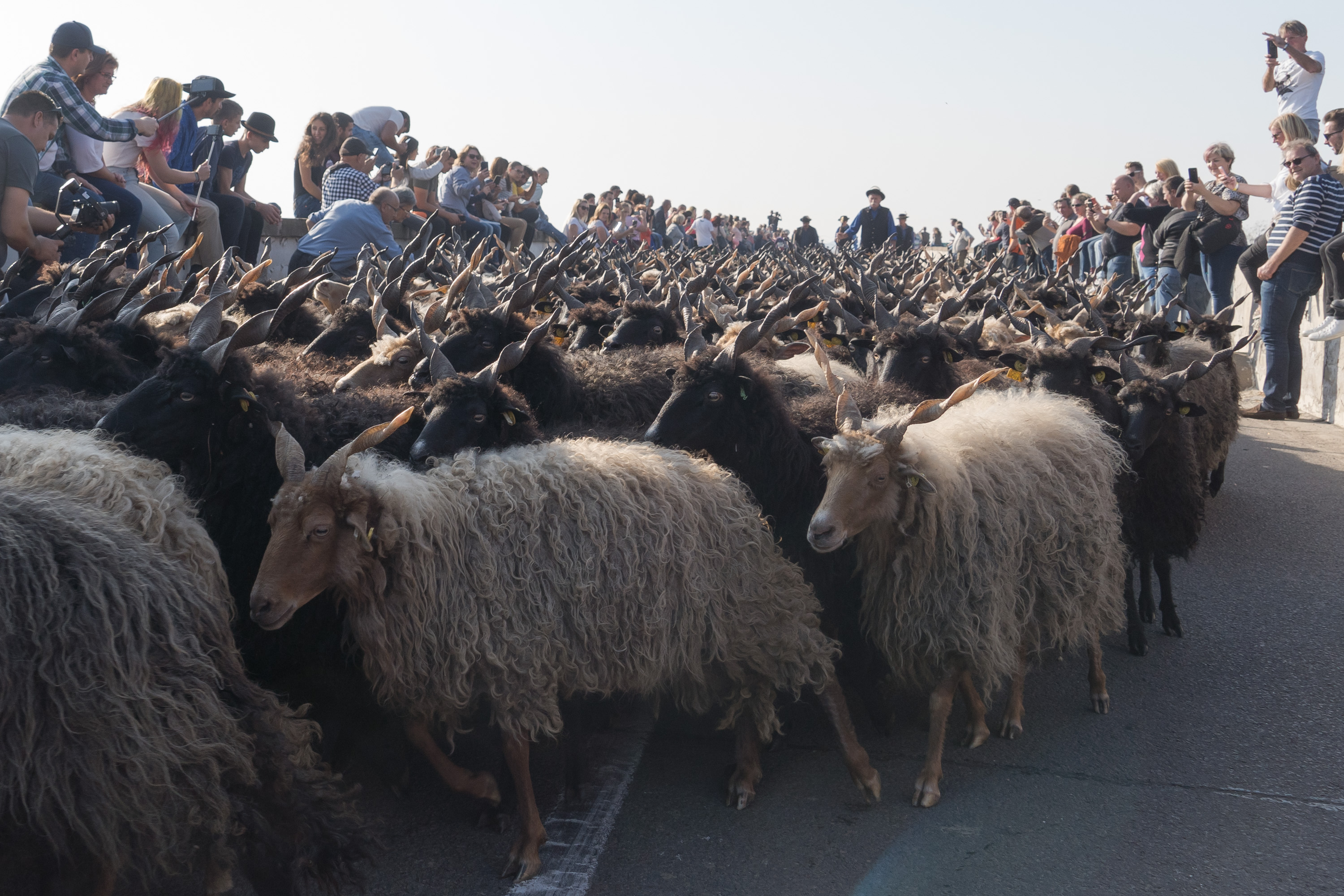 A flock of racka sheep cross a bridge during the celebration of the end of the grazing season in the Great Hungarian Plains in Hortobagy, Hungary, on Oct. 26, 2019. (Photo by Attila Volgyi/Xinhua)