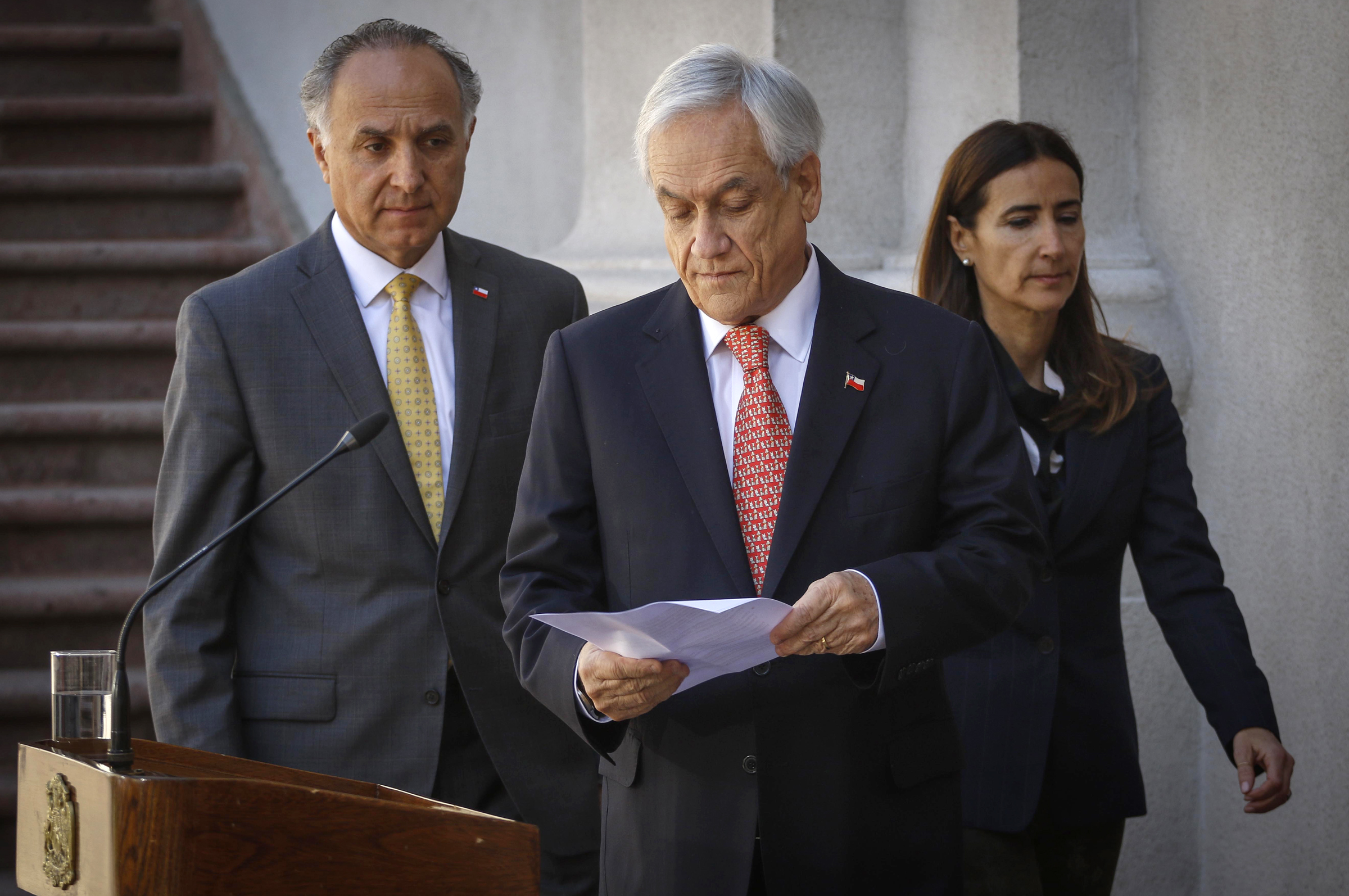 Chilean President Sebastian Pinera (C) arrives to make an announcement at the La Moneda Presidential Palace in Santiago, Chile, on Oct. 30, 2019. Pinera announced Wednesday that Chile will suspend hosting the APEC summit and the COP25 climate summit, due to ongoing social crisis in the South American country. (Sebastian Beltran Gaete/Agencia Uno via Xinhua)