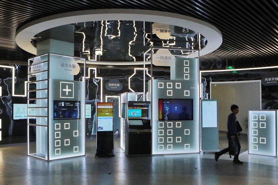 People visit a display center of the National Big Data Comprehensive Pilot Area in southwest China's Guizhou Province, May 22, 2019. (Xinhua/Ou Dongqu)