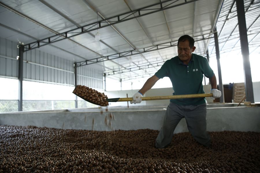 Bi Jiafu dries macadamia nuts at a processing plant in Daxueshan Township, Yongde County, city of Lincang, southwest China's Yunnan Province, Oct. 23, 2019. (Photo provided by Yongde County)