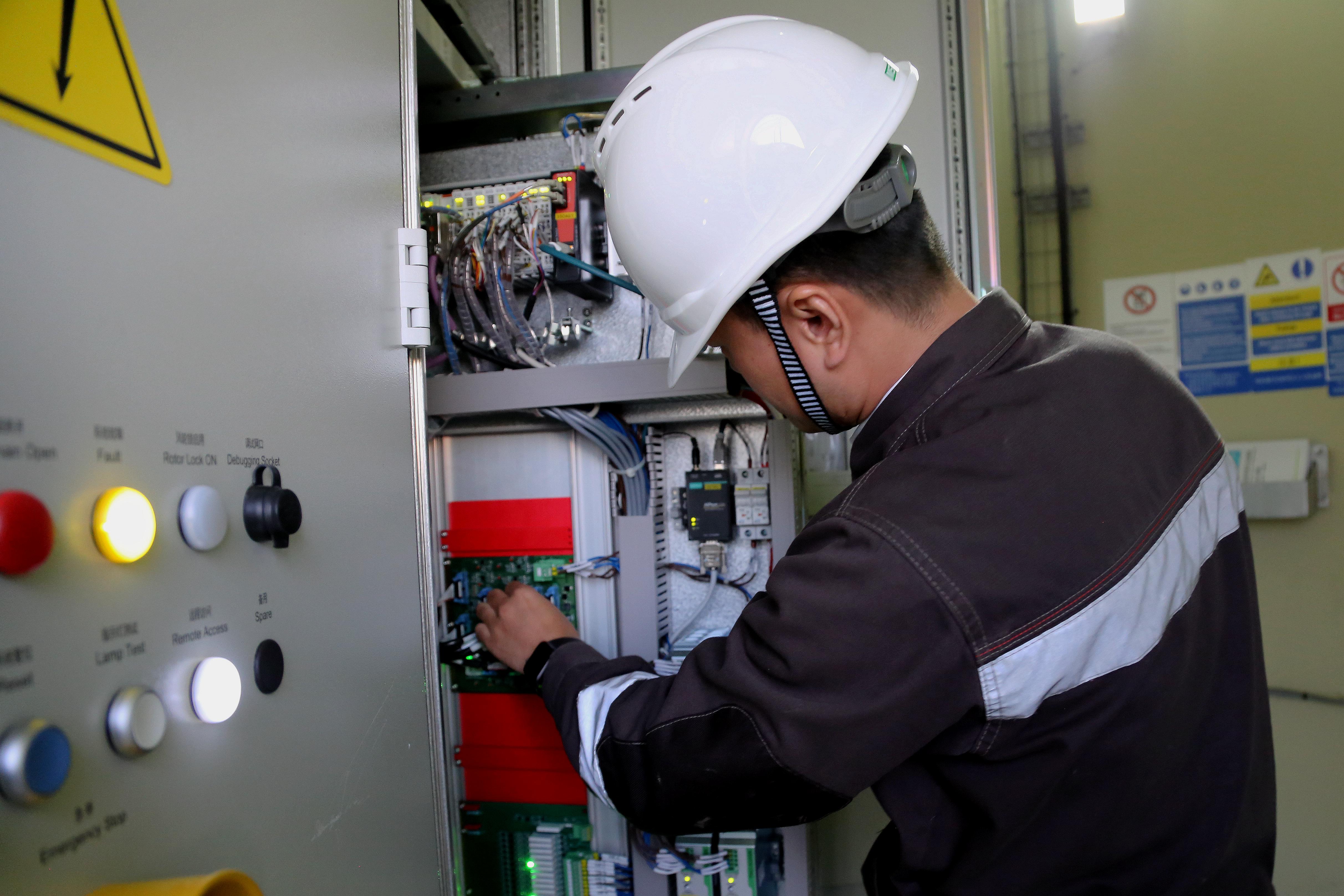 A worker of the China's Shanghai Electric Power Company (SEP) checks the lines inside a wind mill of the Mozura Wind Park in southern Montenegro on Nov. 18, 2019. (Xinhua/Shi Zhongyu)
