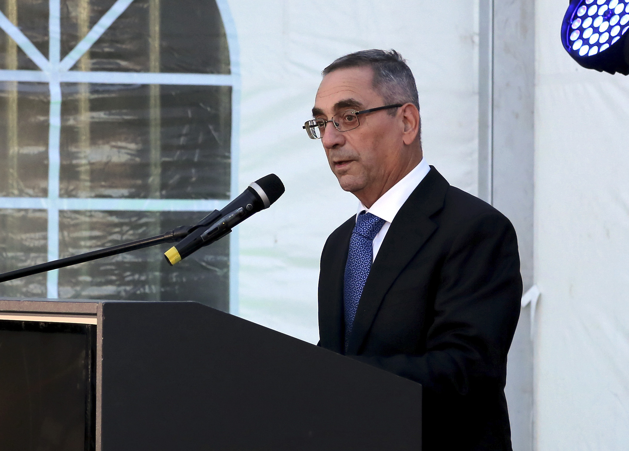 Joe Mizzi, Malta's Minister for Energy and Water Management, gives a speech at the inauguration ceremony of the Mozura Wind Park in southern Montenegro on Nov. 18, 2019. (Xinhua/Shi Zhongyu)