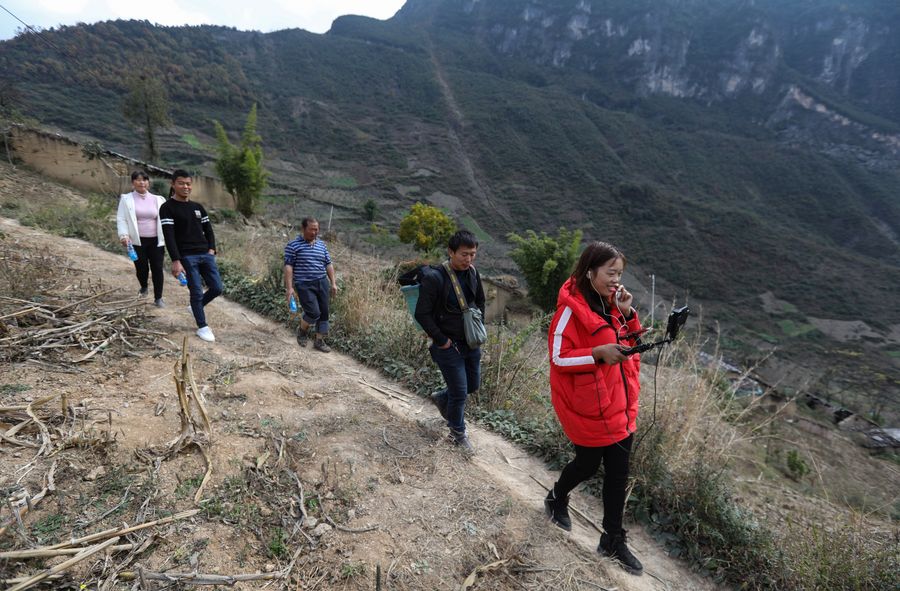 A woman makes live broadcast for fans on the internet about Atulie'er Village, Zhaojue County, Nov. 23, 2019. (Xinhua/Wang Xi)