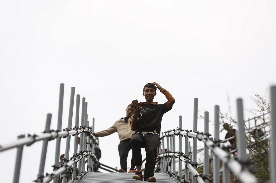 Young men of Yi ethnic group walk down a steel ladder built along the cliff in Atulie'er Village, Zhaojue County, Nov. 23, 2019. (Xinhua/Jiang Hongjing)