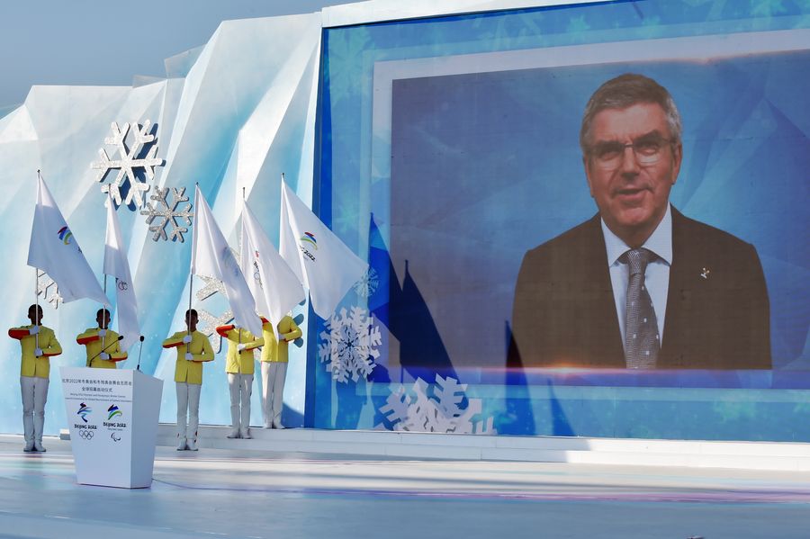 A video message from Thomas Bach, president of the International Olympic Committee, is played during the launching ceremony of the global recruitment of volunteers for the 2022 Olympic and Paralympic Winter Games in Beijing, capital of China, Dec. 5, 2019. (Xinhua/Peng Ziyang)