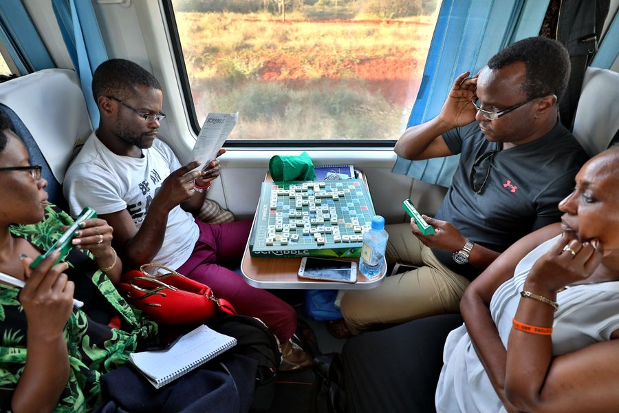 Passengers played scrabble during a train ride on Kenya's Mombasa-Nairobi Standard Gauge Railway (SGR), on June 2, 2018. (Xinhua/Wang Teng)