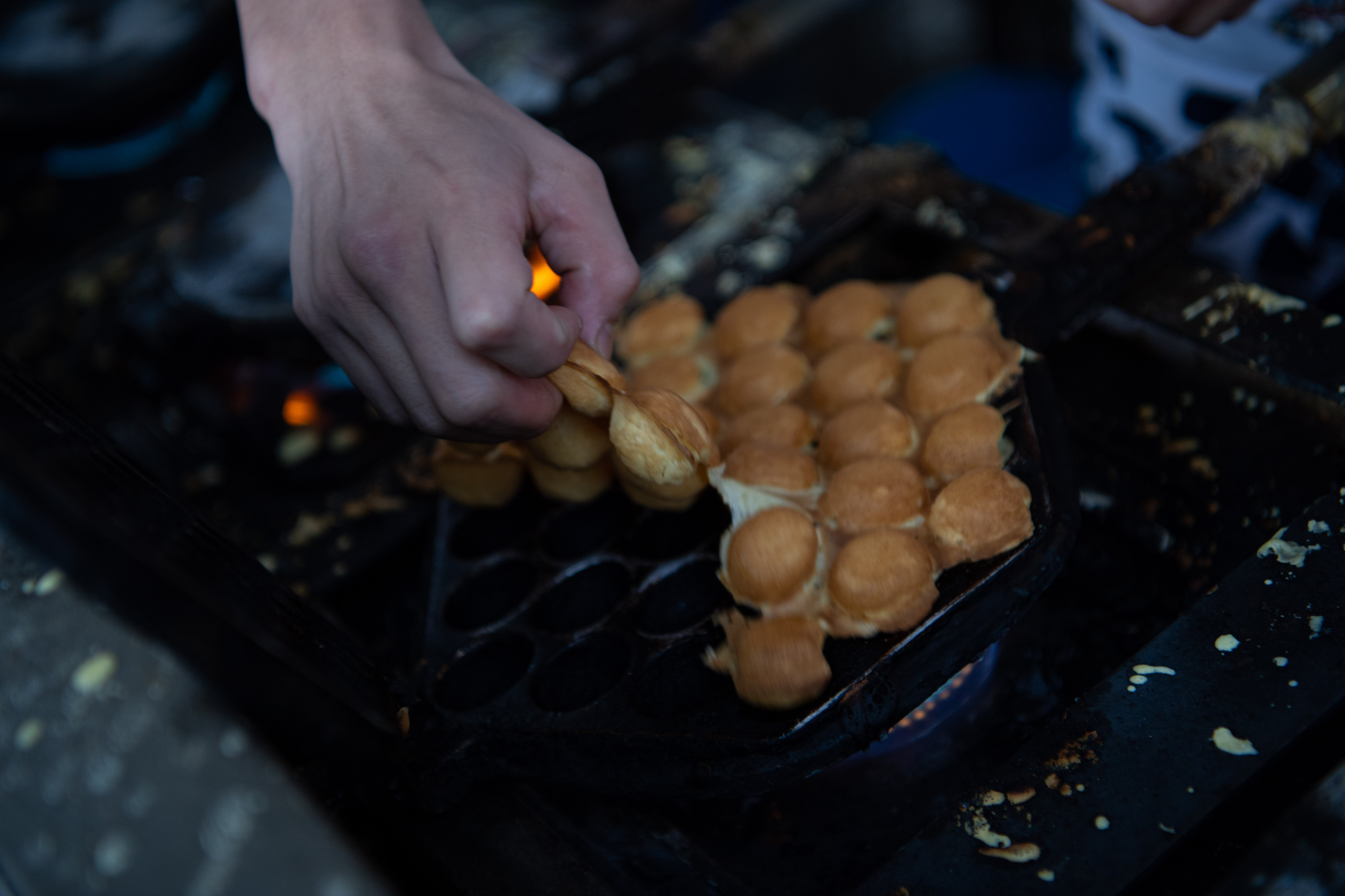 Added with peanut butter or condensed milk, the egg waffle is a typical local snack.