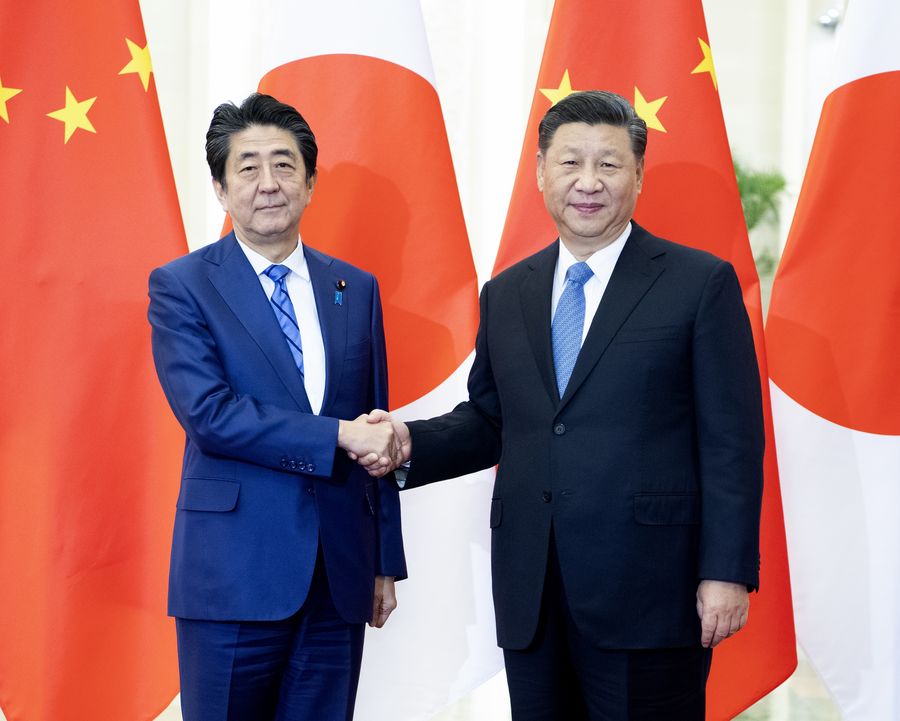 Chinese President Xi Jinping meets with Japanese Prime Minister Shinzo Abe at the Great Hall of the People in Beijing, capital of China, Dec. 23, 2019. (Xinhua/Li Xueren)