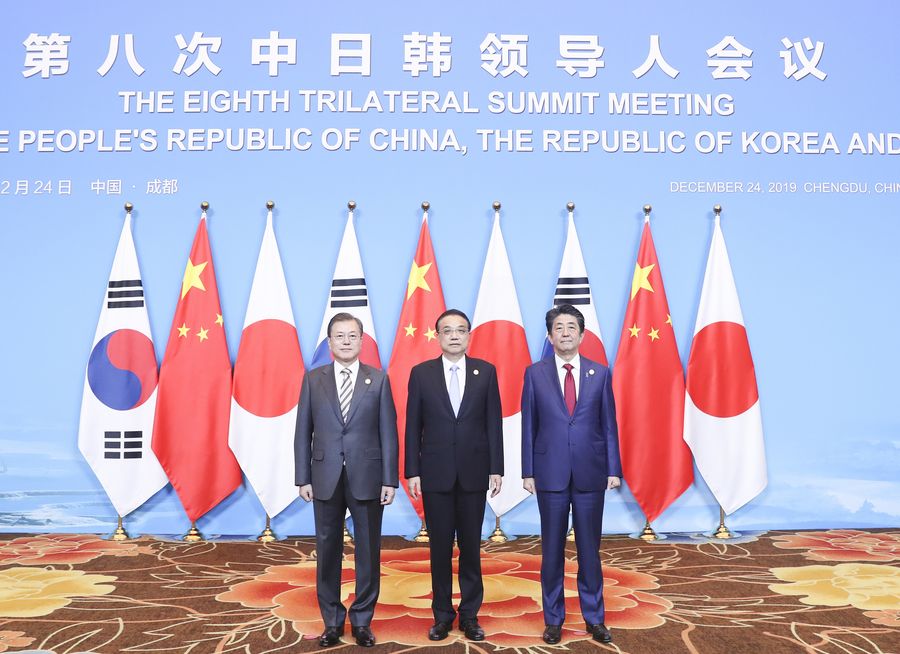 Chinese Premier Li Keqiang poses for a group photo with President of the Republic of Korea (ROK) Moon Jae-in and Japanese Prime Minister Shinzo Abe before the 8th China-Japan-ROK leaders' meeting in Chengdu, southwest China's Sichuan Province, Dec. 24, 2019. (Xinhua/Yao Dawei)