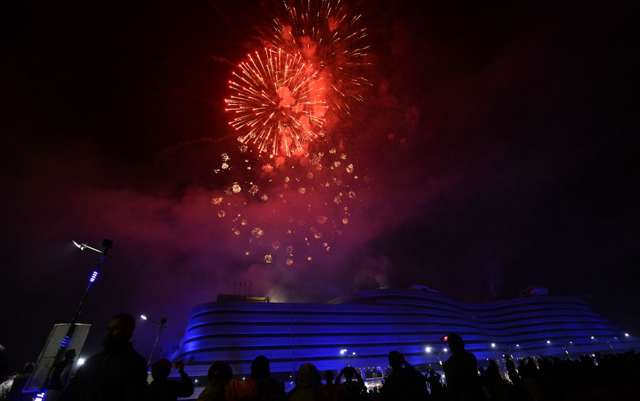 People enjoy the fireworks to celebrate New Year 2020 in Rawalpindi, Pakistan on Jan. 1, 2020. (Xinhua/Ahmad Kamal)