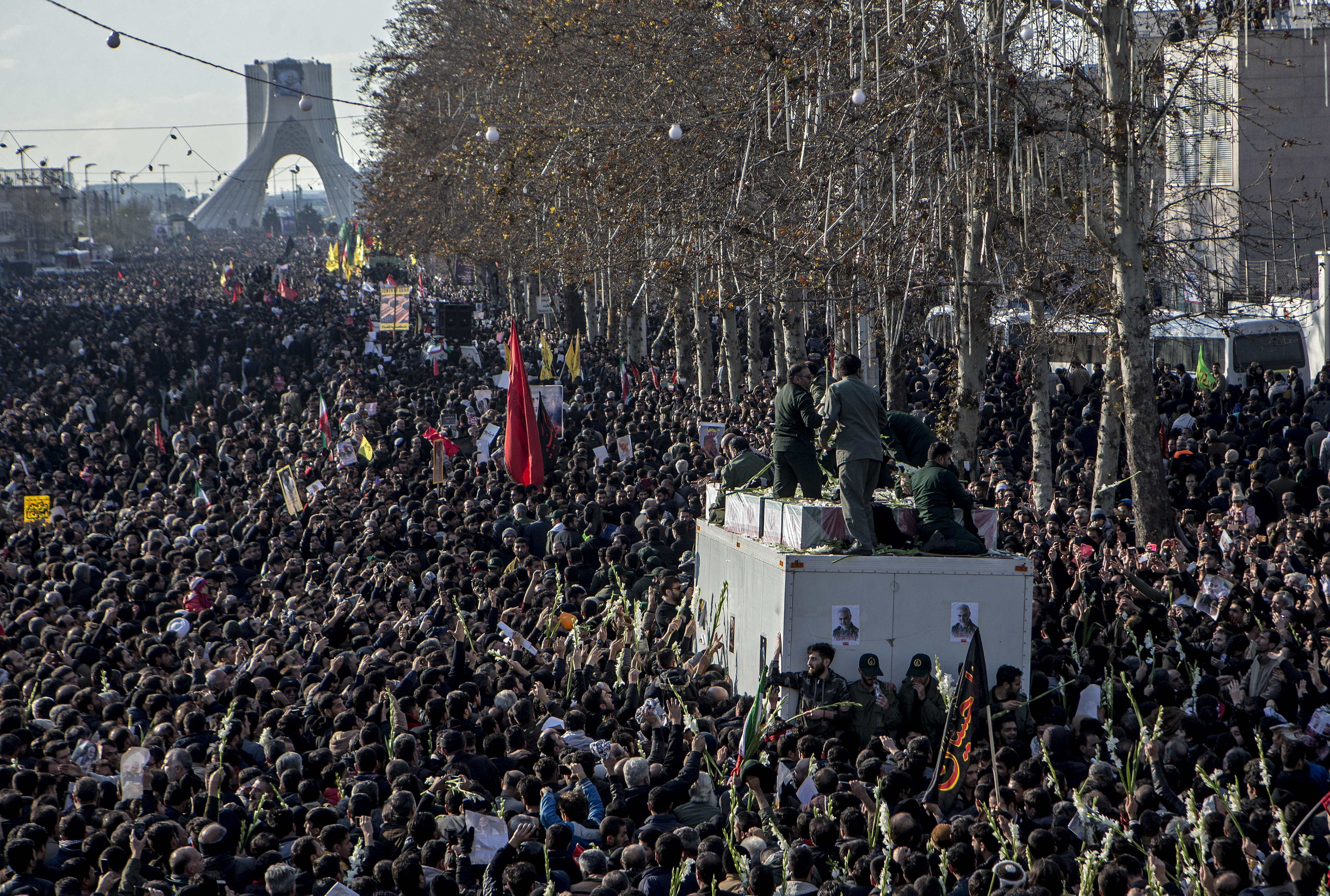 Iranian mourners attend a funeral procession for senior commander Qassem Soleimani slain by the U.S. in Iraq on Friday, in Iranian capital of Tehran, Jan. 6, 2020. (Xinhua/Ahmad Halabisaz)