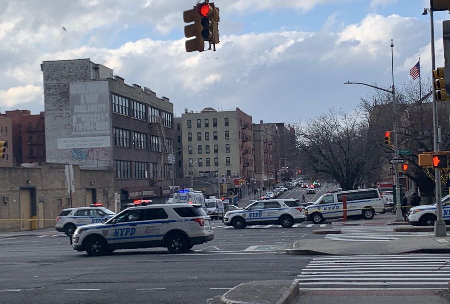 Police vehicles are seen near the site where a gunman opened fire in The Bronx of New York, the United States, on Feb. 9, 2020. (Xinhua/Wang Jiangang)