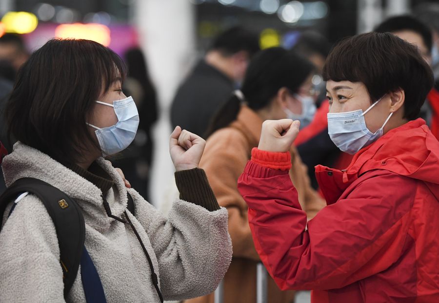 A medical team member (R) from the First Affiliated Hospital of Chongqing Medical University says goodbye to her daughter at Chongqing Jiangbei International Airport in southwest China's Chongqing, Jan. 26, 2020. (Xinhua/Wang Quanchao)