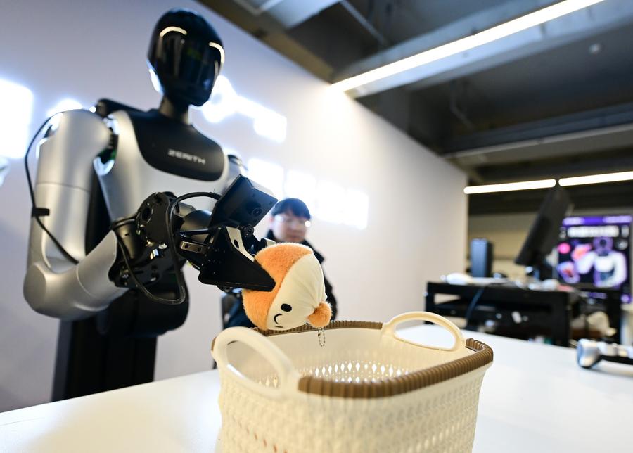 A staff member trains a humanoid robot to fetch objects for data collection purpose at Zerith, a robotics company, in Hefei, east China's Anhui Province, Nov. 25, 2025. (Xinhua/Zhou Mu)