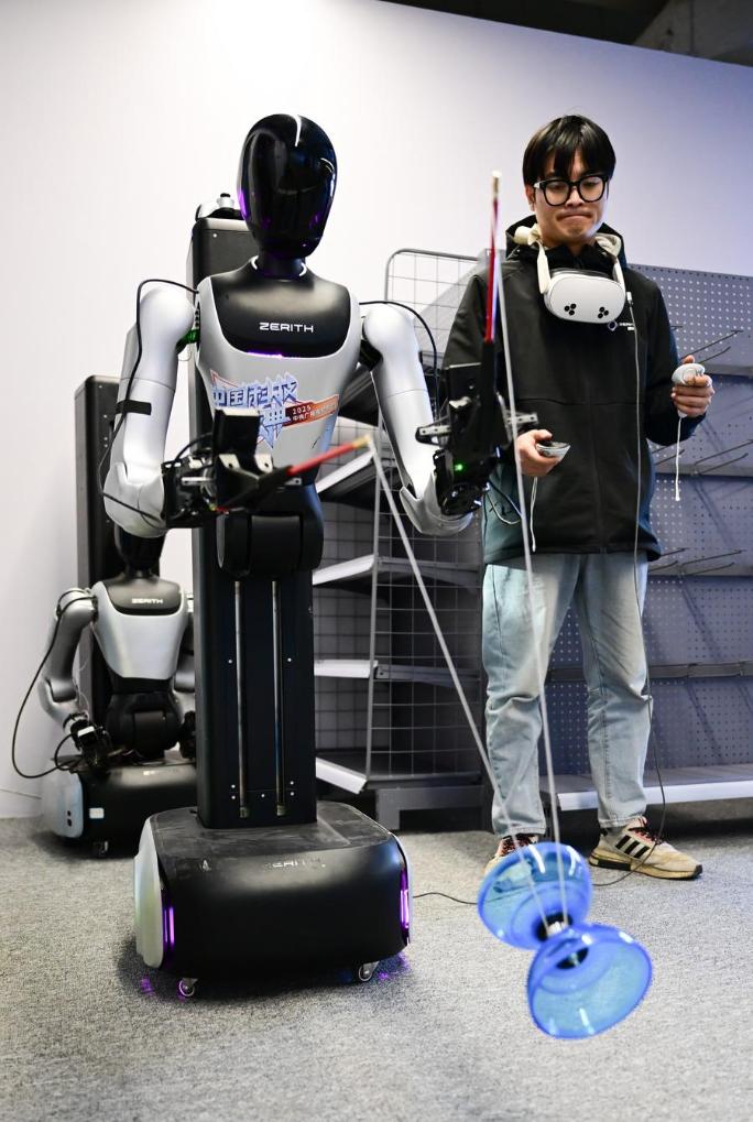 A staff member trains a humanoid robot to play Chinese diabolo (kongzhu) for data collection purpose at Zerith, a robotics company, in Hefei, east China's Anhui Province, Nov. 25, 2025. (Xinhua/Zhou Mu)