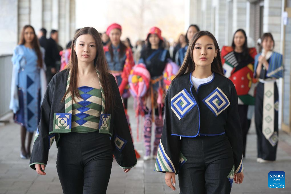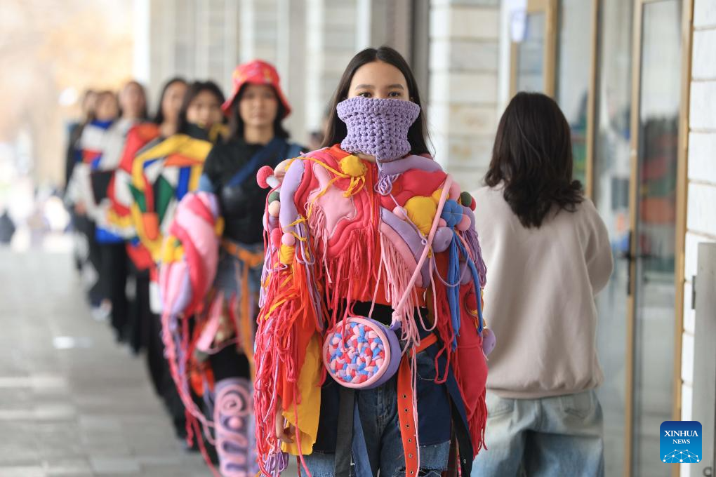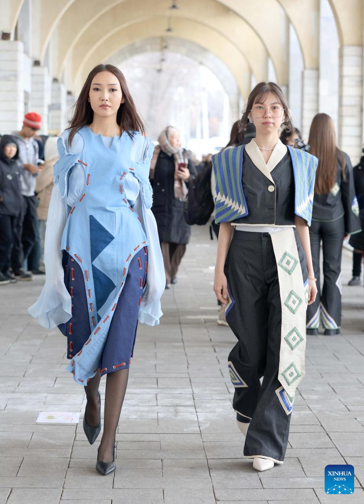 Models display garments made from recycled textile materials at an eco-friendly street fashion show in Bishkek, Kyrgyzstan, Dec. 12, 2025. (Photo by Roman/Xinhua)