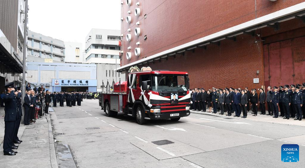 HONG KONG, Dec. 19 (Xinhua) -- The Fire Services Department (FSD) of the Hong Kong Special Administrative Region (HKSAR) government on Friday held an official funeral service with full honors for the late firefighter Ho Wai-ho, who sacrificed his life battling a major blaze in Tai Po. John Lee, chief executive of the HKSAR and a host of senior HKSAR government officials attended the ceremony to pay their respects.