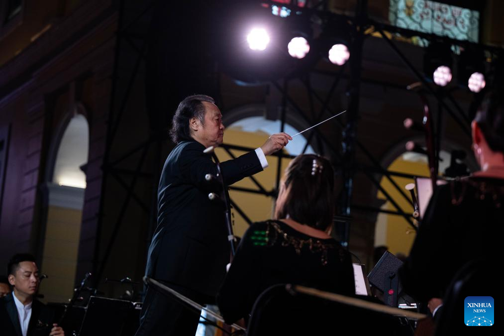 A conductor directs the performance at a concert celebrating the 26th anniversary of Macao's return to the motherland in Macao, south China, Dec. 19, 2025. Titled "Morning Star Lilies Forever", the concert was held here on Friday. (Xinhua/Cheong Kam Ka)