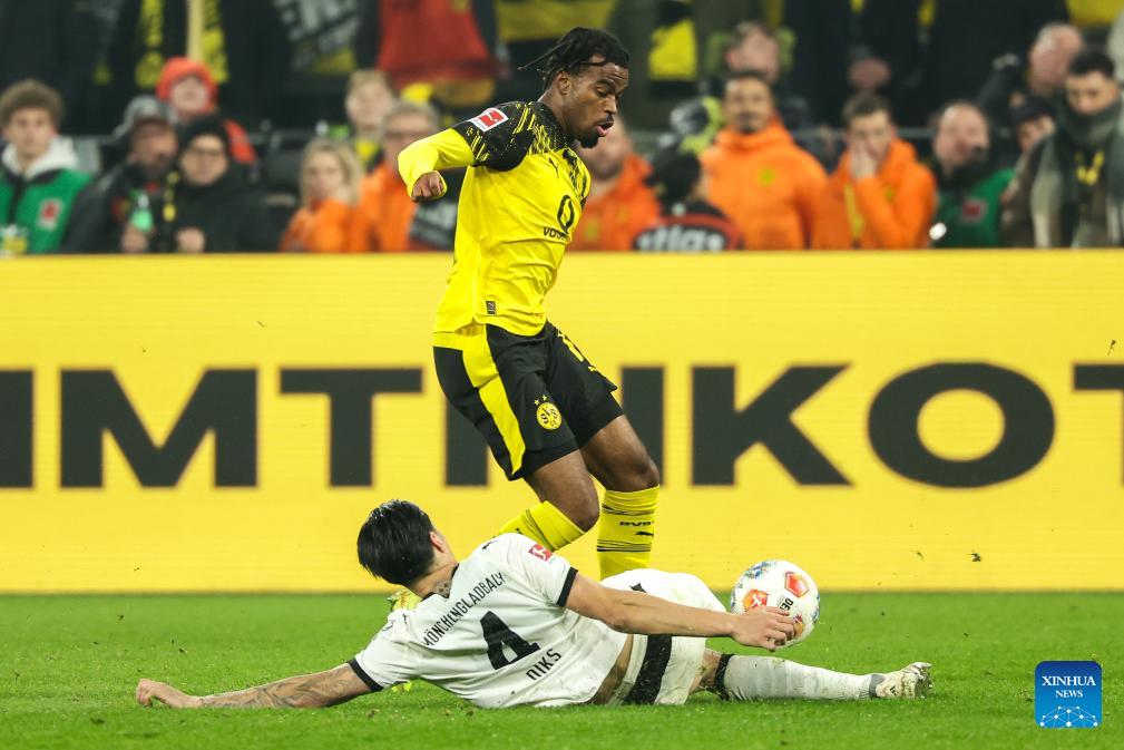 Karim Adeyemi (R) of Borussia Dortmund vies with Kevin Diks of Borussia Moenchengladbach during the German first division Bundesliga football match between Borussia Dortmund and Borussia Moenchengladbach in Dortmund, Germany, Dec. 19, 2025. (Photo by Joachim Bywaletz/Xinhua)