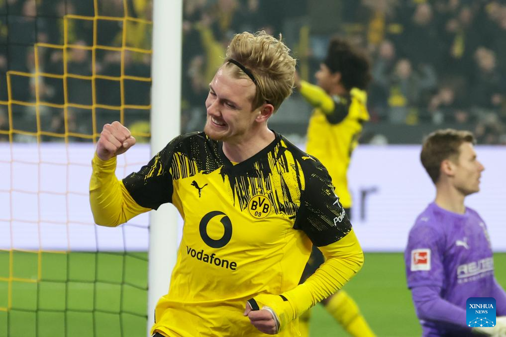 Julian Brandt (front) of Borussia Dortmund celebrates scoring during the German first division Bundesliga football match between Borussia Dortmund and Borussia Moenchengladbach in Dortmund, Germany, Dec. 19, 2025. (Photo by Joachim Bywaletz/Xinhua)