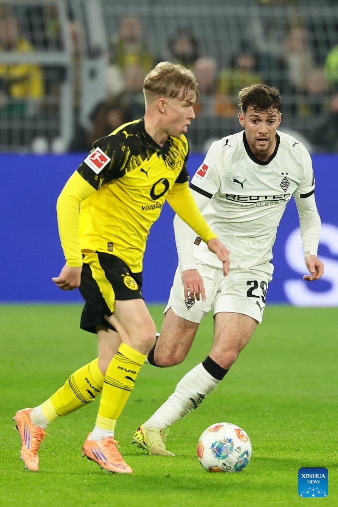 Florian Neuhaus (L) of Borussia Moenchengladbach shoots during the German first division Bundesliga football match between Borussia Dortmund and Borussia Moenchengladbach in Dortmund, Germany, Dec. 19, 2025. (Photo by Joachim Bywaletz/Xinhua)
