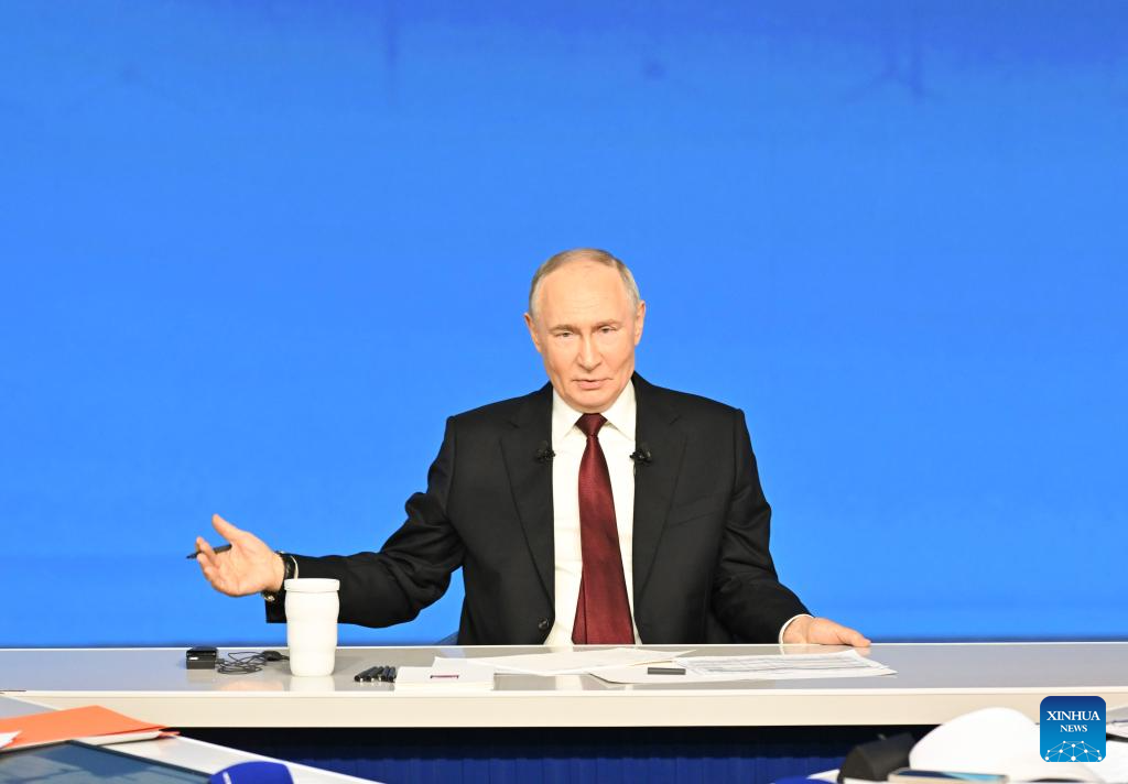 Russian President Vladimir Putin responds to a question from Xinhua reporter during his annual year-end press conference in Moscow, Russia, Dec. 19, 2025. (Xinhua/Hao Jianwei)