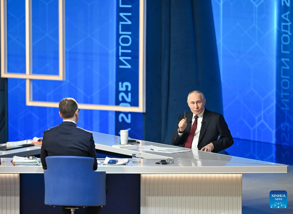 Russian President Vladimir Putin (R) speaks during his annual year-end press conference in Moscow, Russia, Dec. 19, 2025. (Xinhua/Hao Jianwei)