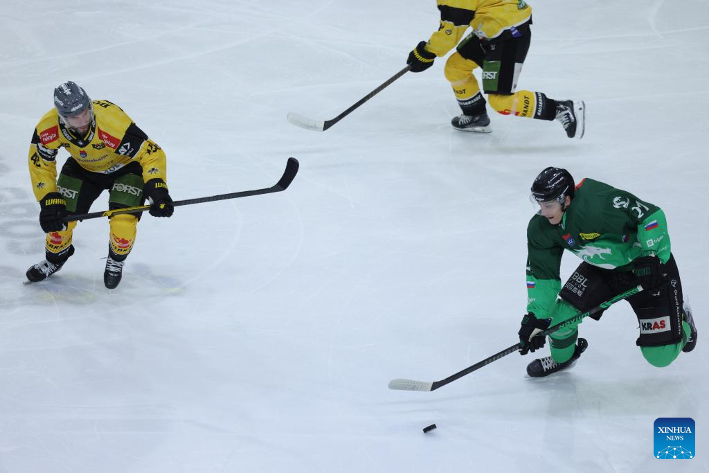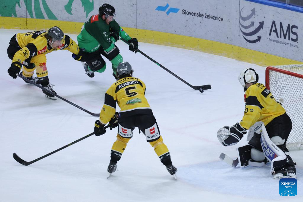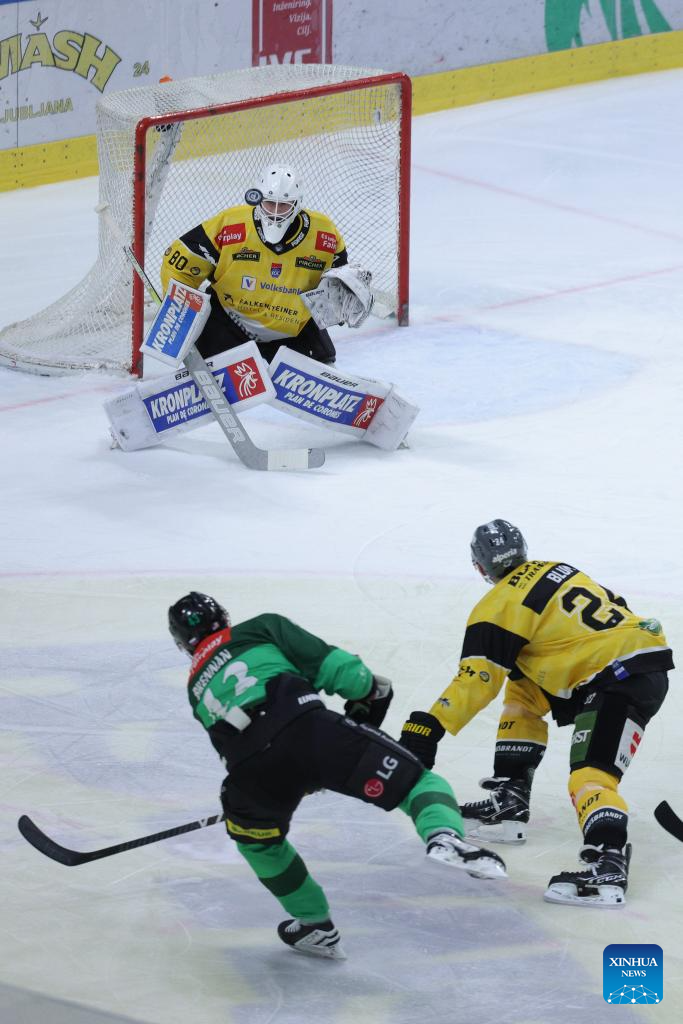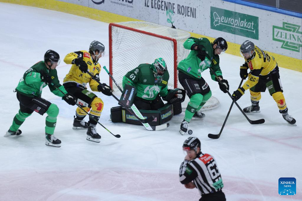Jan Drozg (2nd R) of Olimpija Ljubljana competes during the 2025/26 Win2day Ice Hockey League match between Olimpija LJubljana and HC Falkensteiner Pustertal in Ljubljana, Slovenia, Dec. 19, 2025. (Photo by Zeljko Stevanic/Xinhua)