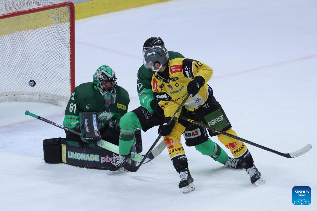 Raphael Andergassen (R) of HC Falkensteiner Pustertal shoots during the 2025/26 Win2day Ice Hockey League match between Olimpija LJubljana and HC Falkensteiner Pustertal in Ljubljana, Slovenia, Dec. 19, 2025. (Photo by Zeljko Stevanic/Xinhua)