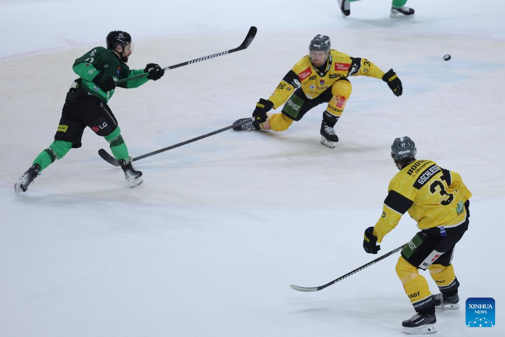 Marly Quince (2nd L) of Olimpija Ljubljana battles for the puck during the 2025/26 Win2day Ice Hockey League match between Olimpija LJubljana and HC Falkensteiner Pustertal in Ljubljana, Slovenia, Dec. 19, 2025. (Photo by Zeljko Stevanic/Xinhua)